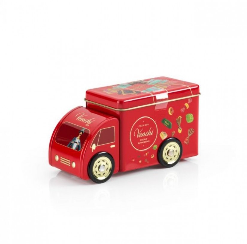 Cioccolatini Chocomousse fondenti e al latte in una simpatica scatola di latta a forma di furgoncino apribile. Un furgoncino che non solo consegna contenuti deliziosi ma è anche bello da vedere!