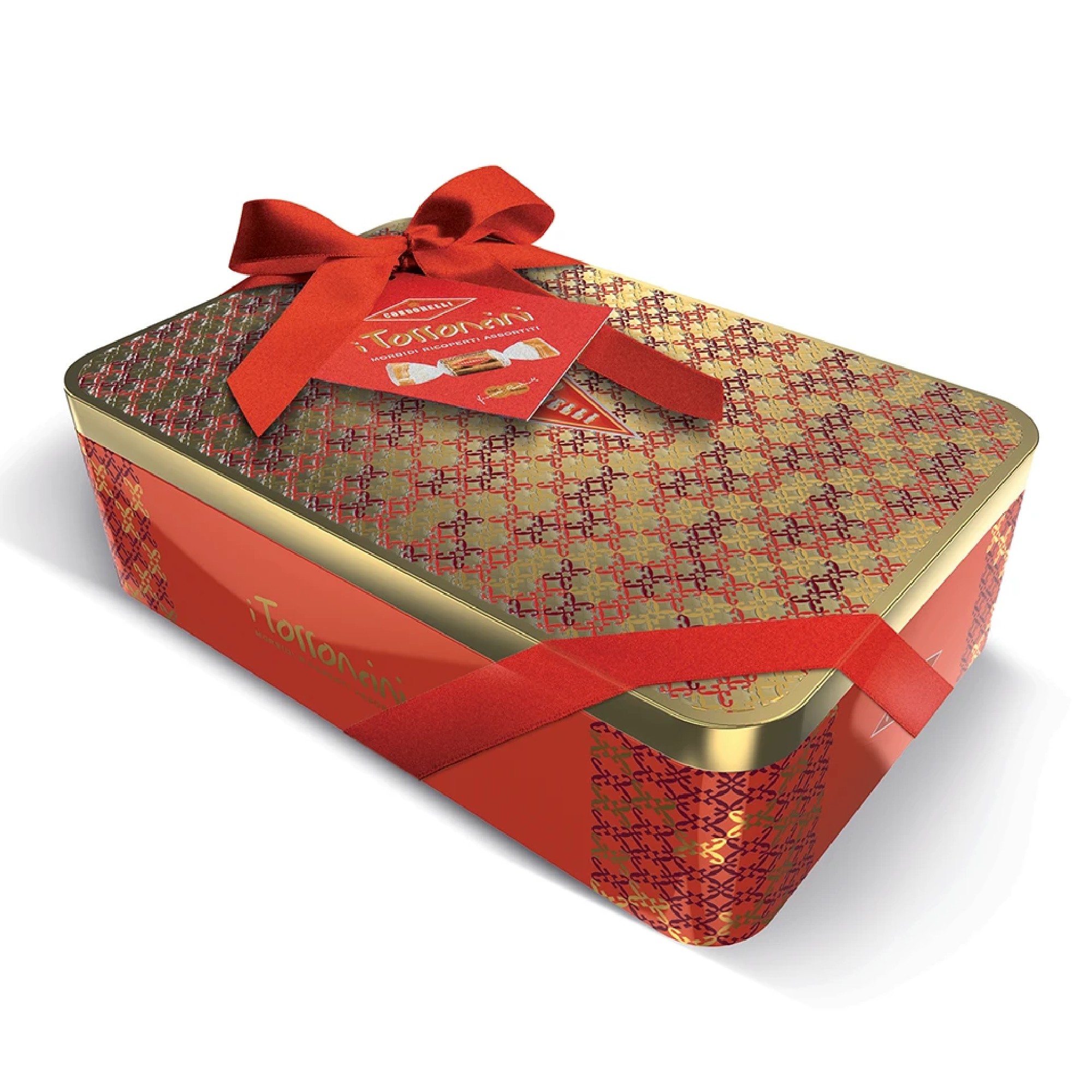 Elegante latta regalo con motivi in rilievo e stampa in oro a caldo. Regala il piacere degli iconici torroncini in una bellissima confezione regalo d’autore.