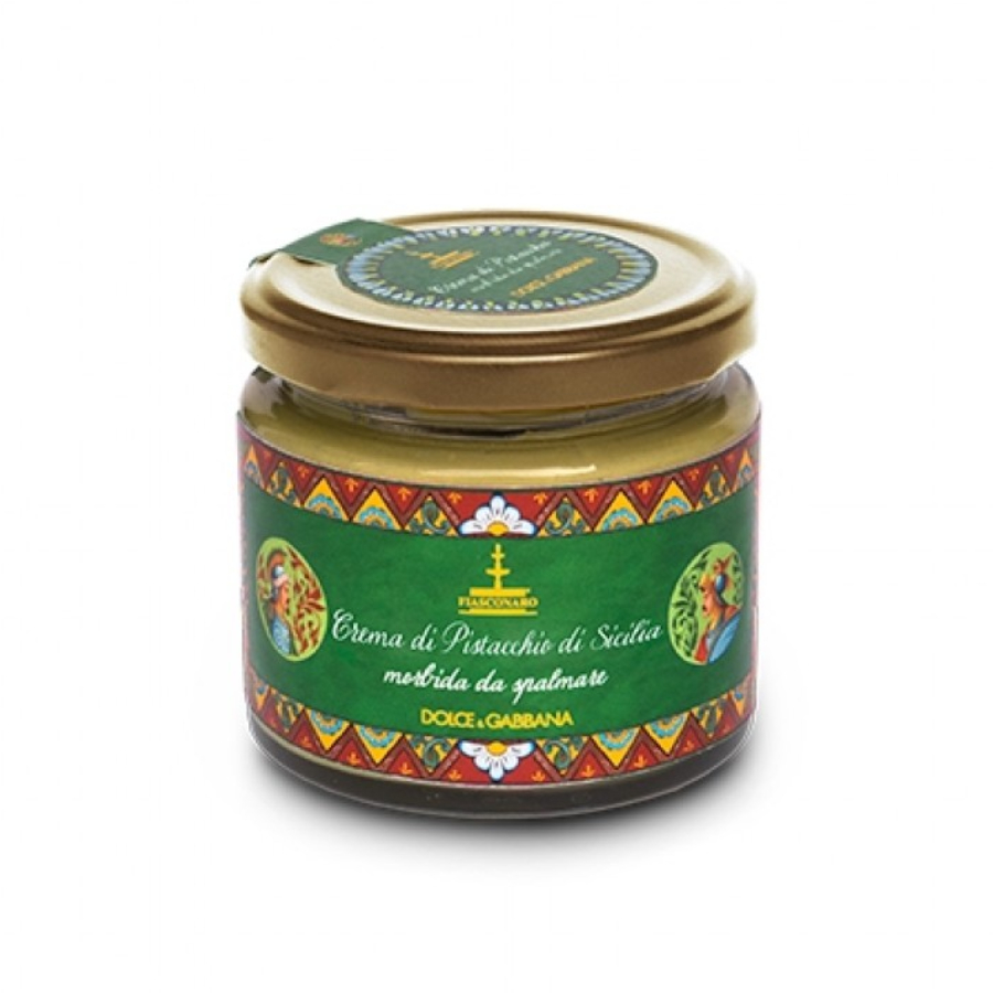 Dall’incontro fra la creatività di Dolce&Gabbana e l’arte dolciaria di Fiasconaro non poteva che scaturire una ricetta unica: il panettone tipicamente milanese rivisitato con i sapori della Sicilia. Panettone con crema di pistacchio da spalmare ricoperto con cioccolato bianco e pistacchi di Sicilia.