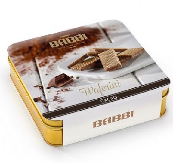 Fiore all occhiello della produzione Babbi, i Waferini con cialda e ripieno al Cacao (circa 80 pezzi) sono racchiusi in eleganti latte perfette come idea regalo gourmet.